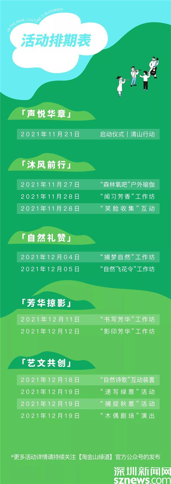 據(jù)悉,自11月27日起連續(xù)四個(gè)周末,深圳公園文化季羅湖分會(huì)場將帶來一系列健康療愈、藝術(shù)文化、傳統(tǒng)文化等戶外活動(dòng),市民可以通過關(guān)注“淘金山綠道”公眾號了解更多活動(dòng)詳情,報(bào)名參加。