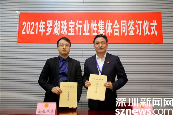 值得一提的是,本次大會還融合了職工權益保障、文明城市創(chuàng)建、企業(yè)服務等內容。在大會現場,舉行了“2021年羅湖區(qū)珠寶行業(yè)集體合同簽訂儀式”。簽訂儀式上,區(qū)珠寶工聯會主席、集體協(xié)商首席代表曾志斌和羅湖區(qū)珠寶企業(yè)協(xié)商首席代表周曉航共同簽訂了《2021年羅湖區(qū)珠寶行業(yè)集體合同》,切實保障了轄區(qū)珠寶企業(yè)職工合法權益;隨后,由“廣東省五一勞動獎章”獲得者郭夷錟宣讀了主題為《攜手新征程,共創(chuàng)新未來》的行業(yè)倡議書,號召全區(qū)珠寶企業(yè)和職工,在深入學習貫徹習近平新時代中國特色社會主義思想、愛崗敬業(yè)、敢為人先、誠信經營等方面爭做表率;同時,為更好地服務轄區(qū)企業(yè),大會特地邀請了羅湖區(qū)企業(yè)服務中心陳良同志為與會代表介紹企業(yè)服務平臺建設與運用情況。