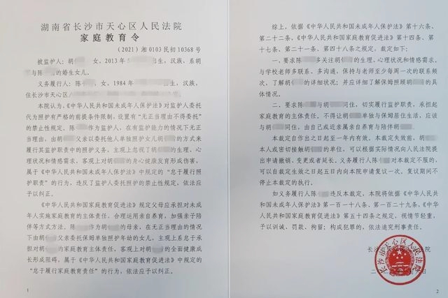 全國首份家庭教育令由長沙市天心區(qū)人民法院發(fā)出。