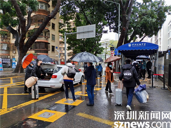 上午8:00左右,深圳市羅湖高級(jí)中學(xué)高三學(xué)子陸續(xù)返校。大雨雖然下個(gè)不停,但是學(xué)生們返校的心情卻絲毫沒有受到影響。在校門口,老師、學(xué)校物業(yè)工作人員為學(xué)生們撐傘、對(duì)行李進(jìn)行消毒、協(xié)助掃碼填報(bào)信息,有序幫助學(xué)生接過行李并用小推車運(yùn)送至宿舍樓。“這次開學(xué)和以往開學(xué)有所不同,我的感觸也很深。下著大雨,老師們忙前忙后為我們運(yùn)送行李,覺得非常感動(dòng)?!绷_湖高級(jí)中學(xué)高三學(xué)子張睿說道。