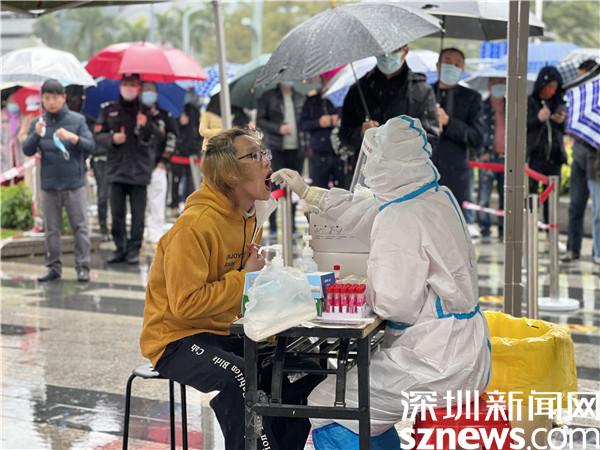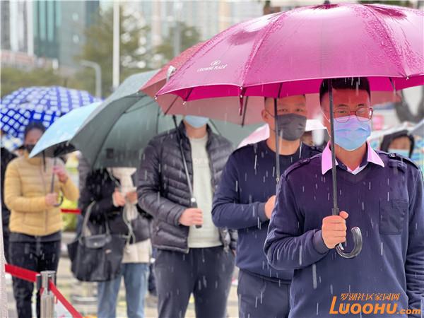 地上是淅瀝瀝的小雨,天氣惡劣,前來開展核酸檢測的市民依然遵守“一米距離”等防疫要求,現場井然有序。