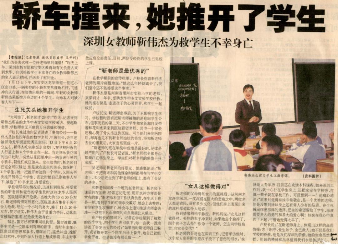 當(dāng)失控的汽車沖向她和4名學(xué)生時(shí),年僅29歲的龍華中英文學(xué)校女教師靳偉杰把生的希望留給了學(xué)生,自己卻獻(xiàn)出了生命。