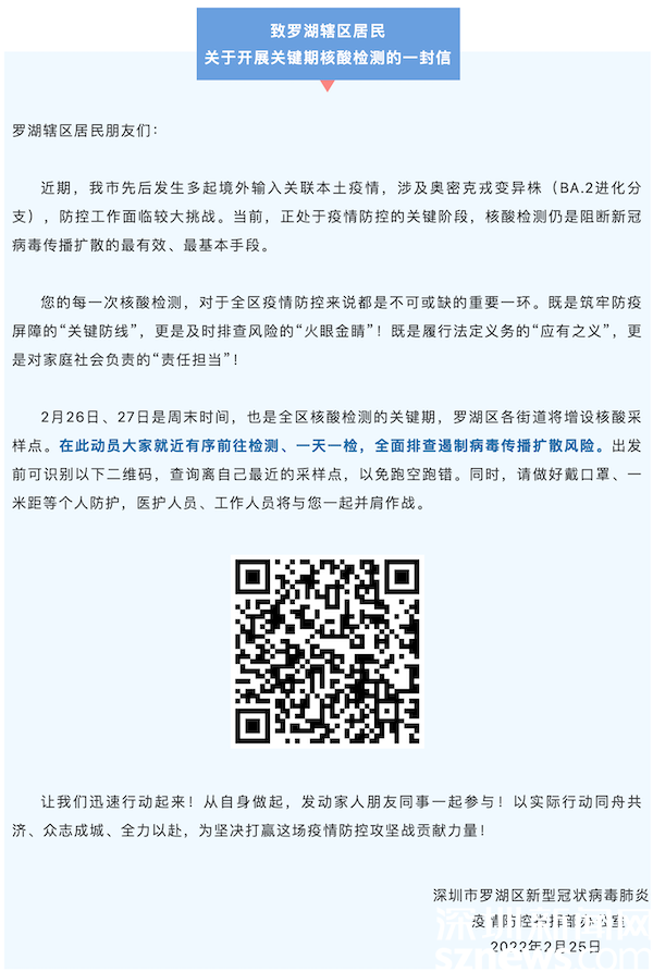 讀特客戶端·深圳新聞網(wǎng)2022年2月26日訊(記者 覃鈺清)2月25日晚,羅湖區(qū)新型冠狀病毒肺炎疫情防控指揮部辦公室發(fā)出《致羅湖轄區(qū)居民關(guān)于開展關(guān)鍵期核酸檢測(cè)的一封信》,該信函指出,本周末(2月26日、27日)是全區(qū)核酸檢測(cè)的關(guān)鍵期,全區(qū)各街道共設(shè)置200個(gè)核酸采樣點(diǎn),動(dòng)員轄區(qū)所有居民就近有序前往檢測(cè)、一天一檢,全面排查遏制病毒傳播擴(kuò)散風(fēng)險(xiǎn)。26日上午,記者前往羅湖區(qū)桂園街道實(shí)地探訪核酸檢測(cè)開展情況。