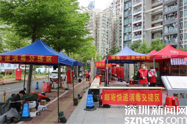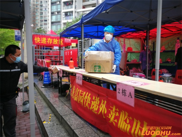 隨著快遞和線上訂菜數(shù)量增多,為了避免居民取快遞聚集以及與快遞員頻繁接觸,寶龍管理嘉園管理處決定在小區(qū)正門設(shè)立快遞外賣臨時(shí)存放點(diǎn),根據(jù)樓棟、物品類型等進(jìn)行分類,實(shí)行“無(wú)接觸”配送。存放點(diǎn)麻雀雖小,但五臟俱全:分別設(shè)有快遞消毒分揀區(qū)、郵寄快遞消毒交接區(qū)、消毒分類中轉(zhuǎn)區(qū)、快遞存放區(qū)、外賣(生鮮蔬菜快餐)存放區(qū)。