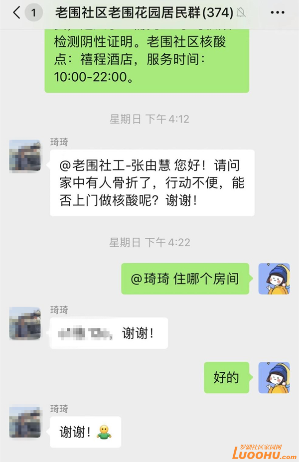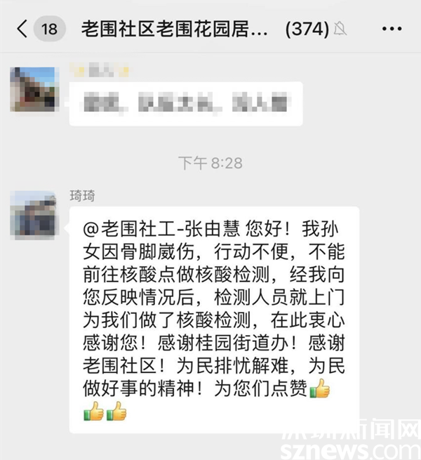 讀特客戶端·深圳新聞網(wǎng)2022年7月14日訊(記者 劉嘉敏 通訊員 楊紀(jì)歐)7月12日晚上8點(diǎn)多,羅湖區(qū)桂園街道老圍社區(qū)的居民琦琦在居民微信群里向社工張由慧說(shuō):“您好!我孫女因骨腳崴傷,行動(dòng)不便,不能前往核酸點(diǎn)做核酸檢測(cè),經(jīng)我向您反映情況后,檢測(cè)人員就上門為我們做了核酸檢測(cè),在此衷心感謝您!感謝桂園街道辦!感謝老圍社區(qū)!為民排憂解難,為民做好事的精神!為你們點(diǎn)贊。”