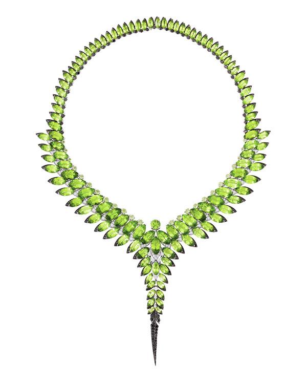 此外,橄欖石不僅是珠寶首飾材料,也可化身服裝、腕表及擺件的組成部分。乘著設計師、藝術家的無窮想象力,橄欖石與多媒介、多材質(zhì)相結(jié)合,碰撞出斑斕旖旎的時尚表達——讓這一抹鮮亮的綠色,成為游走于日常生活的獨特色彩。