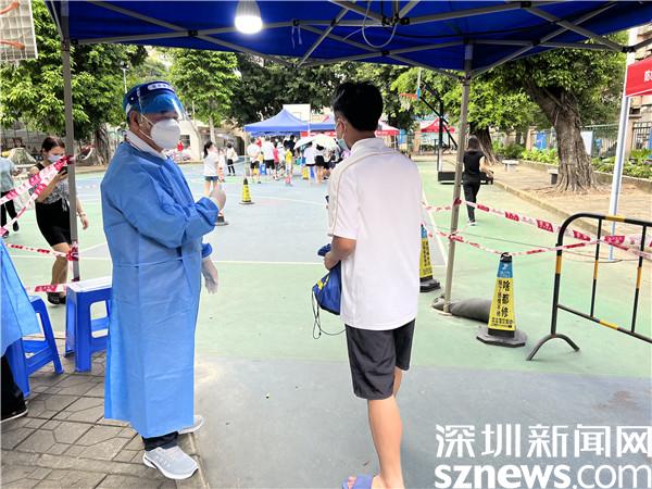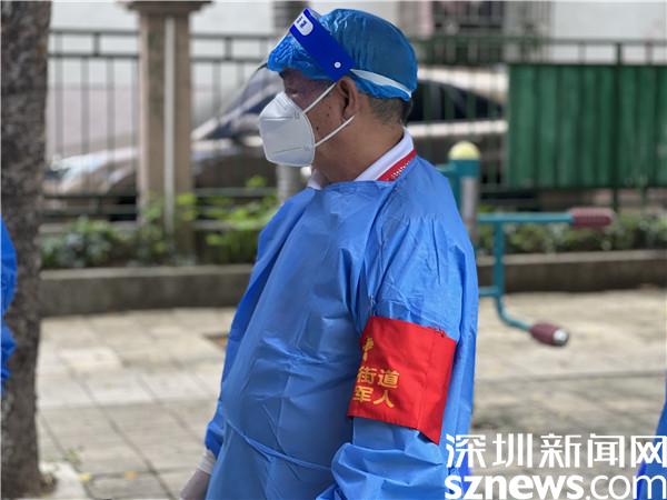 每到下午4點(diǎn),羅湖區(qū)翠竹街道龍屋小區(qū)的籃球場(chǎng)上,都有陸陸續(xù)續(xù)迎來(lái)做核酸的居民,而李任平,則會(huì)提前半個(gè)小時(shí)到達(dá)現(xiàn)場(chǎng)準(zhǔn)備,每日如此,風(fēng)雨無(wú)阻。穿上防護(hù)服,戴上防護(hù)面罩,將“翠竹街道退役軍人”的臂章戴上,鮮紅的黨員徽章別在胸前,李任平就開始站在核酸檢測(cè)點(diǎn)卡口前,指引做核酸的居民掃碼、亮碼,維持秩序。