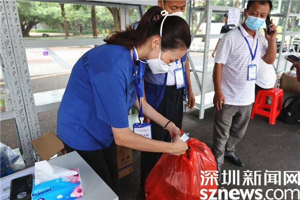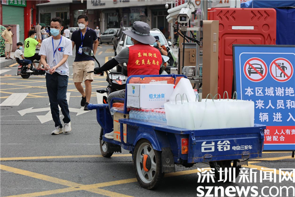 在新平村口,記者看到村口外圍已用水馬進(jìn)行合圍,來自街道、疾控、社區(qū)還有大望實(shí)業(yè)股份有限公司、梧桐山實(shí)業(yè)股份有限公司等單位的工作人員正在準(zhǔn)備開展工作。在合圍的多個出入口處設(shè)置了快遞、外賣投放點(diǎn),由防疫人員為中、高風(fēng)險的居民送貨上門。
