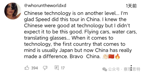 (中國的科技水平又上了一個(gè)臺(tái)階......我很高興Speed在中國舉辦了這次巡演。我知道中國人擅長科技,但我沒想到會(huì)這么好。飛行汽車、水上汽車、翻譯眼鏡......說到科技,首先想到的國家通常是日本,但現(xiàn)在中國真的做出了改變。中國萬歲?。?/p>