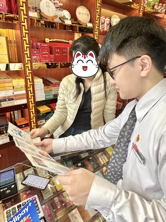 在早餐店、煙酒行為店員與客戶進行反假宣傳、發(fā)放宣傳折頁。