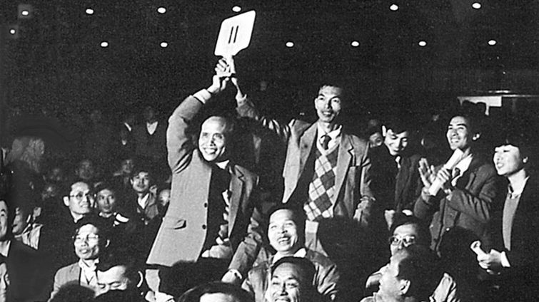 20世紀(jì)80年代初,蛇口青年工在標(biāo)語牌下留影
