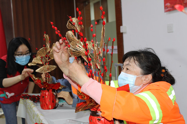 2月4日,適逢農(nóng)歷小年,社工以邀請函的形式,邀請了轄區(qū)企業(yè)員工、城中村保潔員,以及社區(qū)高齡空巢老人、獨(dú)居老人等,齊齊插年花。