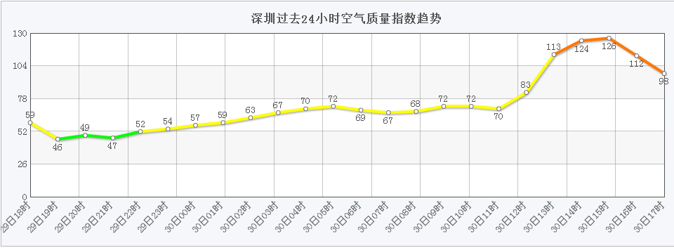 PM2.5監(jiān)測網(wǎng)數(shù)據(jù):深圳空氣指數(shù)全天最差的時段是下午三點(diǎn)。