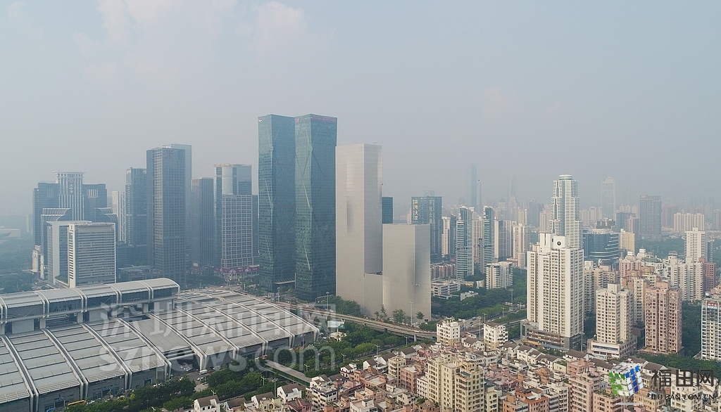 無人機(jī)在數(shù)百米高空俯瞰灰霾籠罩下的深圳中心區(qū),大半個城區(qū)都看不清楚。