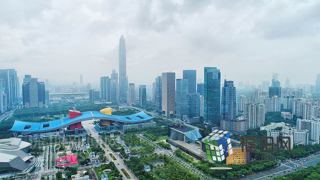 俯視近處的福田中心區(qū)。正南方的市民中心橫臥在前,猶如一只振翅欲飛的大鵬鳥。
