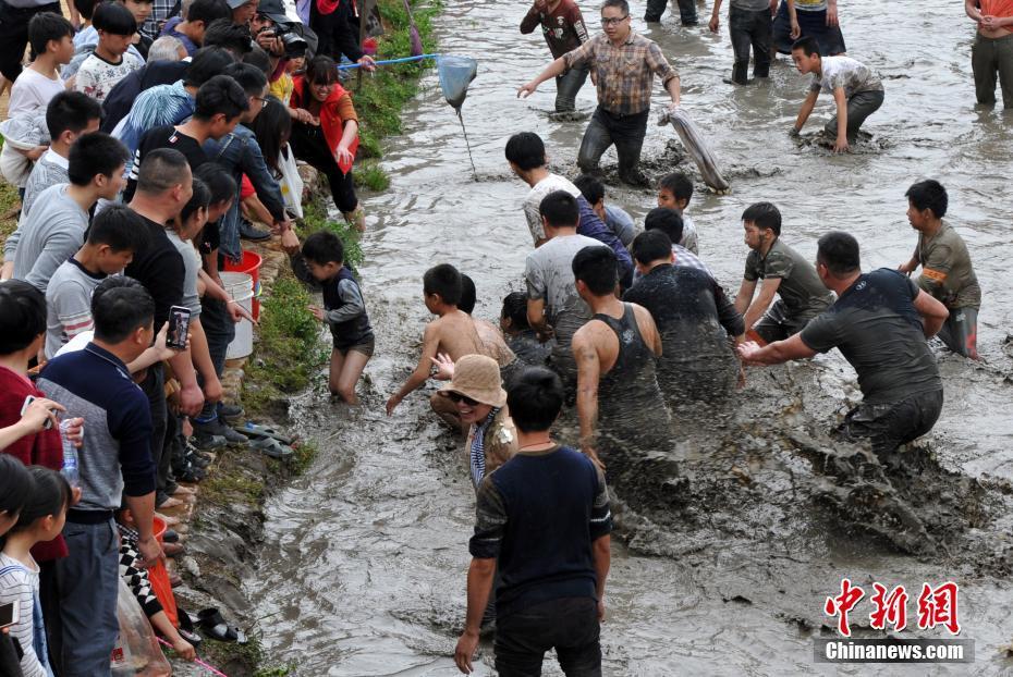 3月17日,福建省龍巖市連城縣莒溪鎮(zhèn)璧洲古村落內(nèi),一場(chǎng)“抓魚(yú)鬧春田”的活動(dòng)吸引了許多市民前來(lái)參與。圖為民眾在泥塘的渾水中抓魚(yú)。中新社記者 張斌 攝