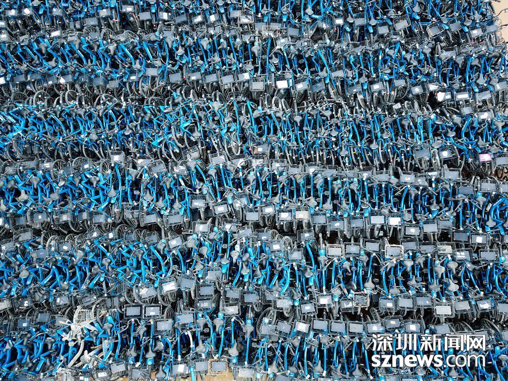 大量的小藍(lán)單車堆放在龍崗區(qū)水官高速旁的空地