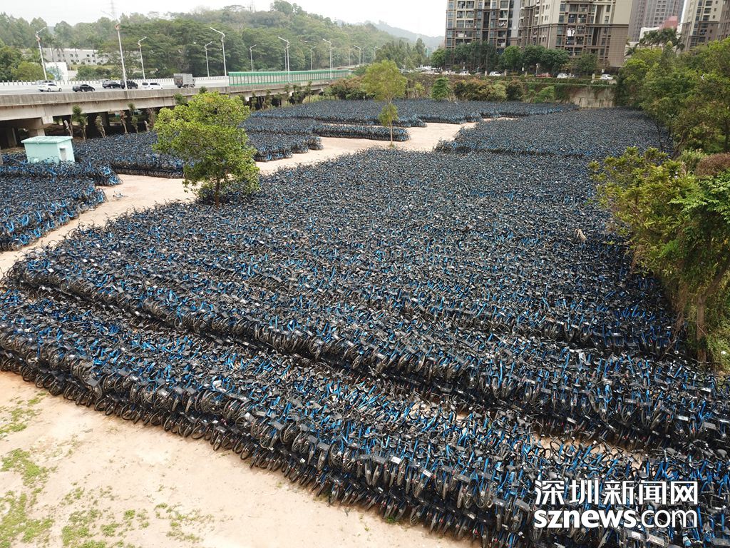 大量的小藍(lán)單車堆放在龍崗區(qū)水官高速旁的空地