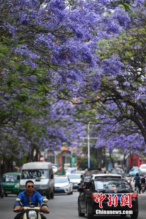 5月2日,昆明市區(qū)一道路兩旁的藍(lán)花楹盛開,車輛在“花街”穿行。 中新社記者 任東 攝