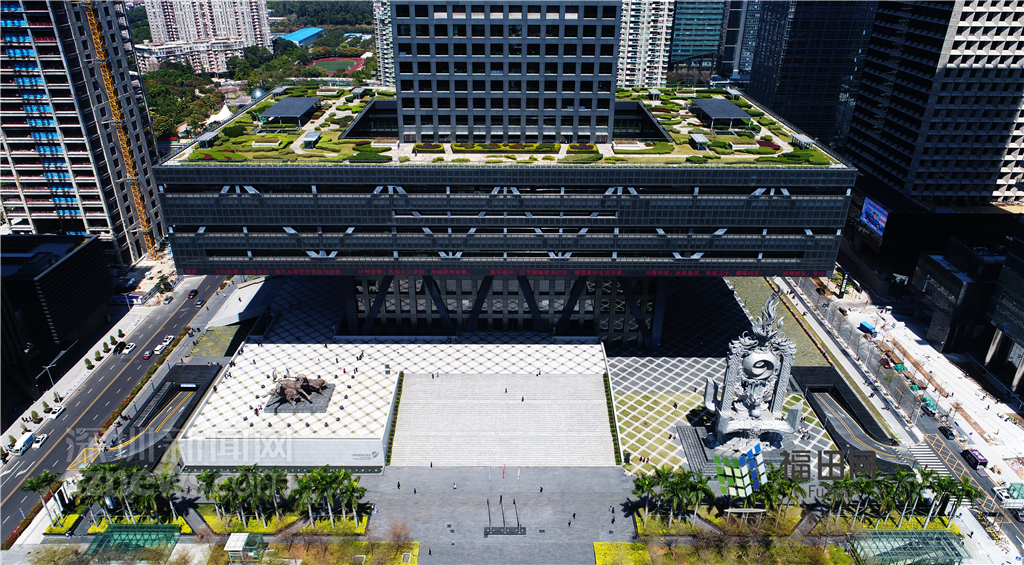深交所由方正的塔樓和空中懸挑的裙樓所組成,大廈底座被抬升至30多米形成一個巨大的“漂浮平臺”。