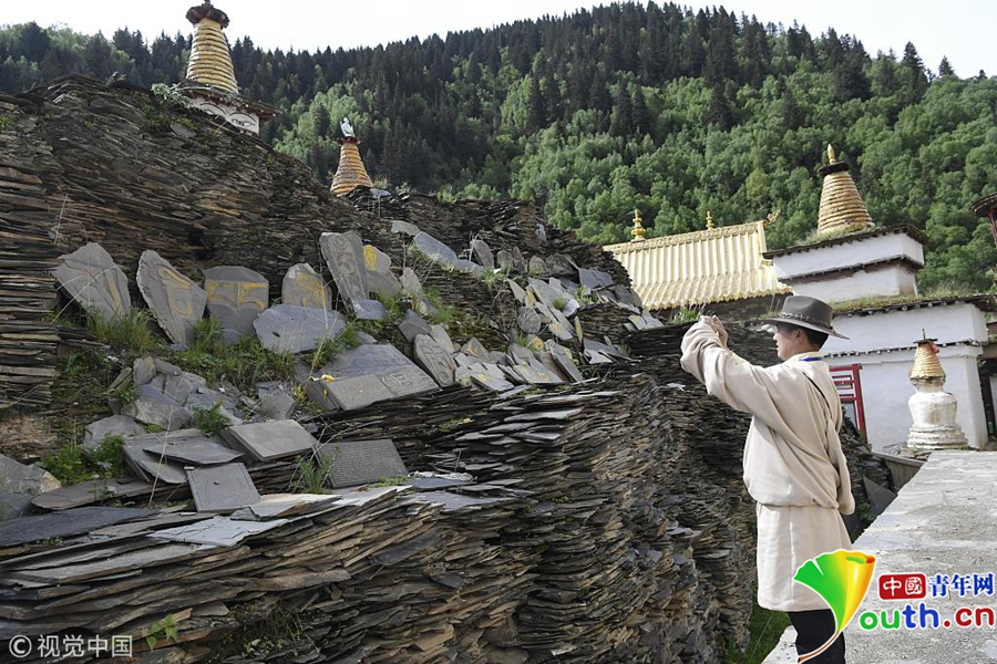 在四川阿壩州壤塘縣棒托寺內(nèi)珍藏約50萬片明清時(shí)期鐫刻的大藏經(jīng)《甘珠爾》和《丹珠爾》,大藏經(jīng)左高9.7米,右高9.2米,長46米、左寬160米,右寬13米,占地598平方米,是目前全世界保存最完整、規(guī)模最宏大、內(nèi)容最豐富的石刻大藏經(jīng)孤品。據(jù)史料記載,由明末清初60余名石匠辛勤鐫刻9年而成。石刻藏文經(jīng)書圖文并茂,筆法流暢,疏密有致,陰陽相背,滿版生輝。具有極高的文物和藝術(shù)研究價(jià)值。圖為堆積的石刻大藏經(jīng)孤品。圖片作者/視覺中國