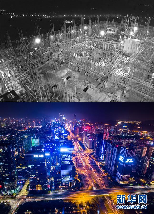 拼版照片:上圖為建筑工人在深圳國(guó)際貿(mào)易中心大廈工地工作(資料照片,新華社記者陳學(xué)思攝);下圖為2017年2月14日無人機(jī)拍攝的深圳夜景(新華社記者毛思倩攝)。新華社發(fā)