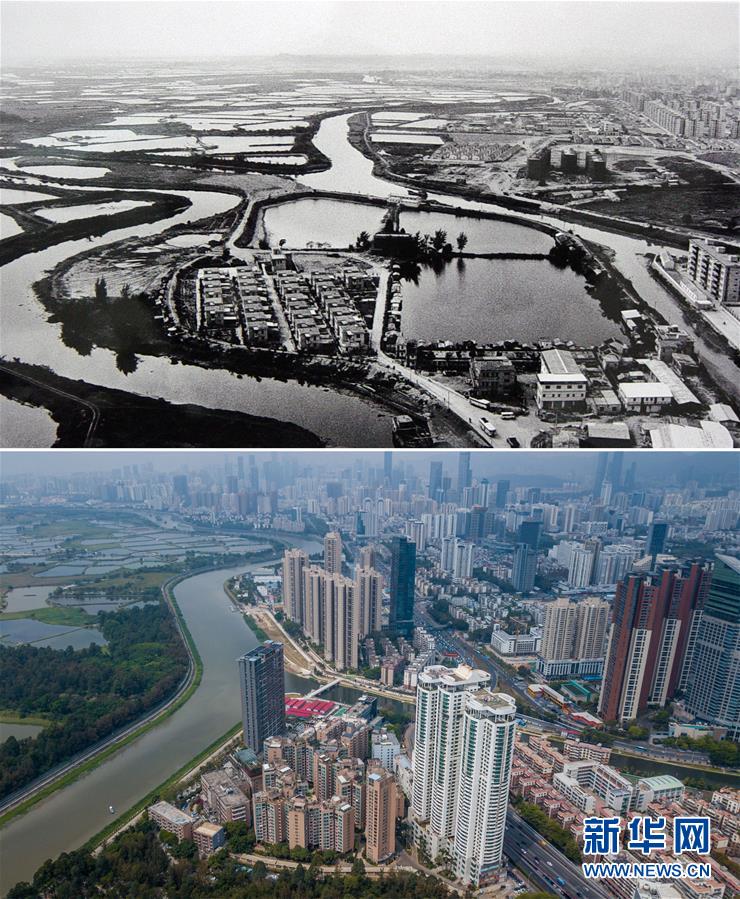 拼版照片:上圖為上世紀(jì)80年代初的深圳漁民村(資料照片,新華社發(fā));下圖為2018年3月26日無人機(jī)拍攝的漁民村(畫面前面的高樓,新華社記者毛思倩攝)。漁民村坐落于深圳河畔,從上世紀(jì)70年代水草飄零的漁船人家到改革開放以來中國第一個“萬元戶村”,如今已經(jīng)變成加載高科技設(shè)備實(shí)現(xiàn)智能化管理的現(xiàn)代社區(qū)。新華社發(fā)