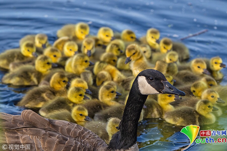 這只加拿大鵝和它的伴侶幫初次當(dāng)父母的同伴照看小孩,幼鵝們整齊劃一的樣子十分可愛(ài),似幼兒園春游。