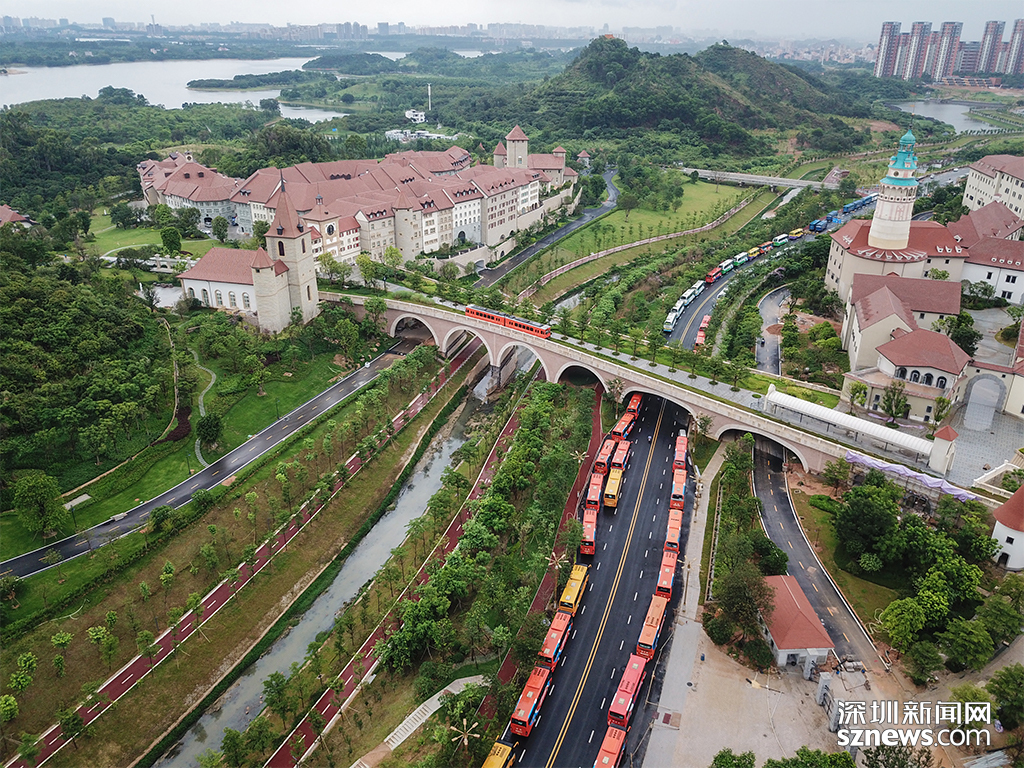 專為家住深圳的員工準備的通勤大巴整齊停在道路兩側(cè)