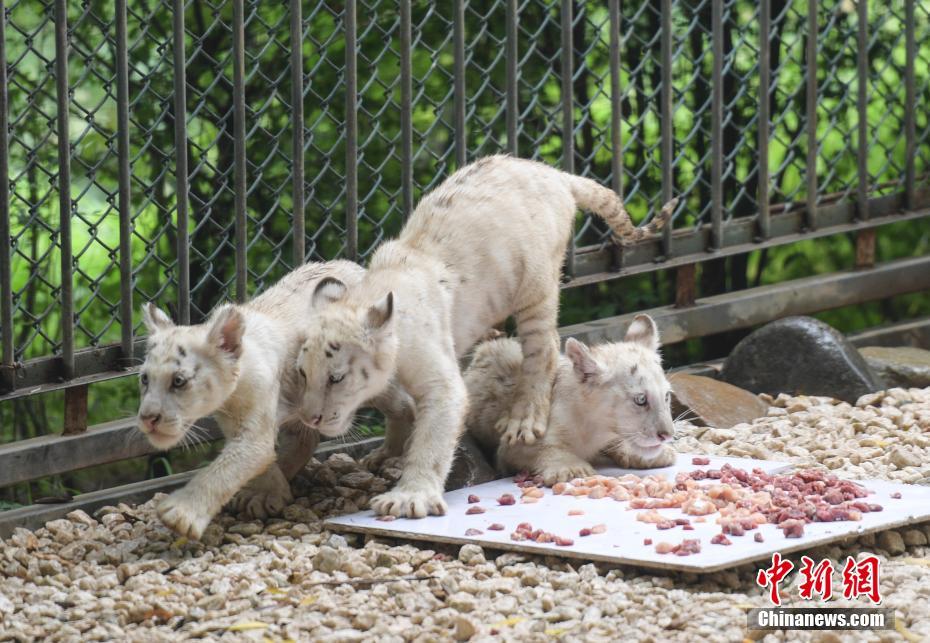 7月10日,雪虎五胞胎分享“肉餡蛋糕”。當(dāng)日,濟(jì)南野生動(dòng)物世界五胞胎雪虎誕生滿(mǎn)百日,正式與游客見(jiàn)面。中新社記者 張勇攝
