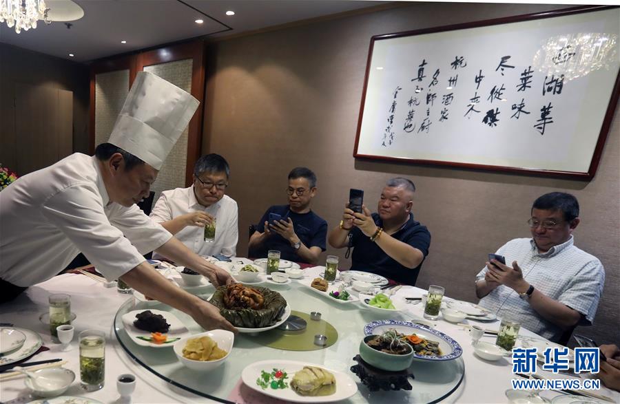 杭州酒家老板吳瑞康為客人端上自己親自制作的“叫化雞”(6月16日攝)。 金庸在武俠小說《神雕俠侶》中借郭靖之口說過: “為國為民,俠之大者?!蔽鋫b精神在香港備受推崇,有其心向中華文化的情感基礎(chǔ)。在這個國際美食之都,品味舌尖上的武俠味,內(nèi)中的感覺別有深意。新華社記者 李鵬 攝