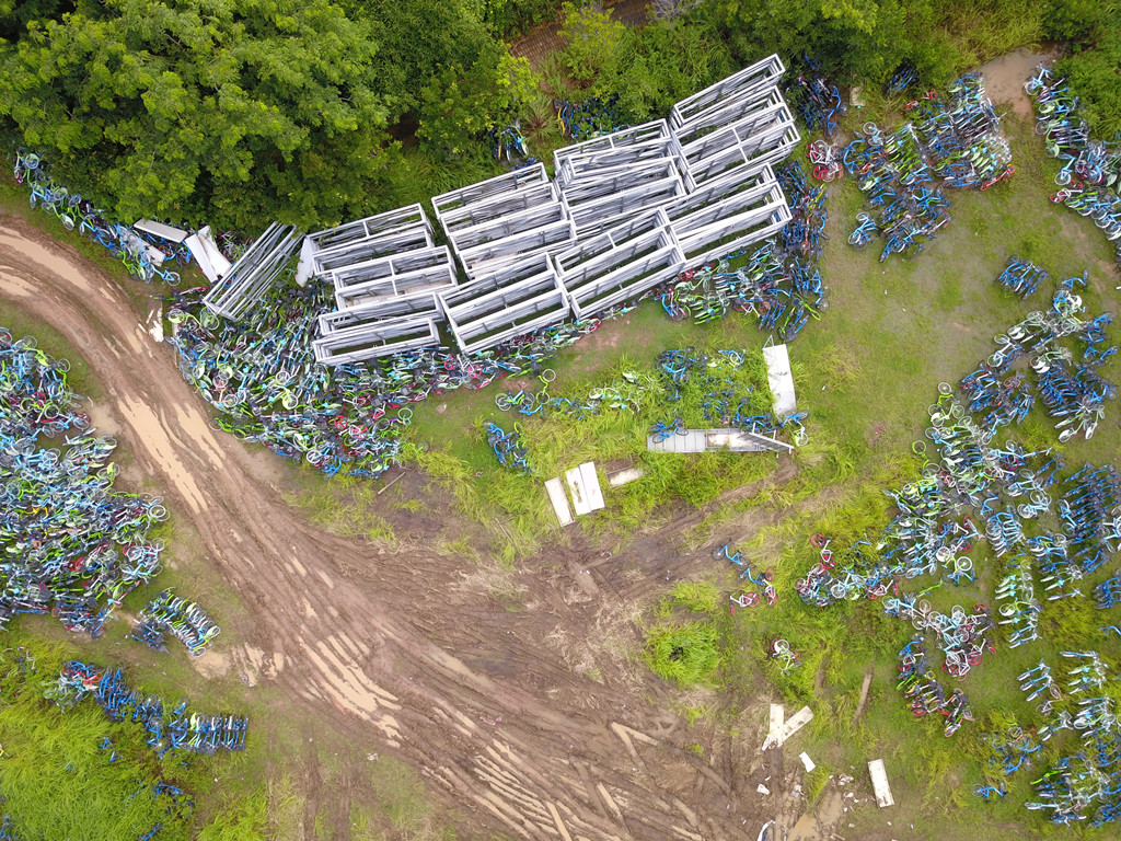 從高空中能夠看到,堆放的單車大多為目前無法正常運(yùn)營(yíng)的酷騎、小藍(lán)單車