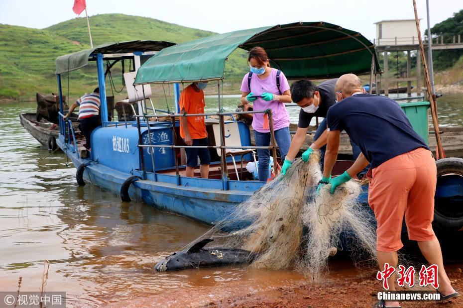 8月1日早晨,濂溪區(qū)護豚隊接到漁民打來的電話,在湖口縣鄱陽湖的屏峰水域,發(fā)現(xiàn)水中絲網(wǎng)里有一頭江豚,懷疑已死亡。接到電話后,正在芳蘭湖清理水中定制網(wǎng)的濂溪區(qū)護豚隊隨即趕到現(xiàn)場。護豚隊隊員趕到現(xiàn)場時看到,事發(fā)地點距離岸邊約30米,一頭大江豚全身被水中的絲網(wǎng)纏住,無法動彈。見此情況,大家將渾身纏滿絲網(wǎng)的江豚連網(wǎng)一起運至岸邊,同時與中科院武漢水生生物所取得聯(lián)系。洪永林 攝 圖片來源:視覺中國 文字來源:九江新聞網(wǎng)