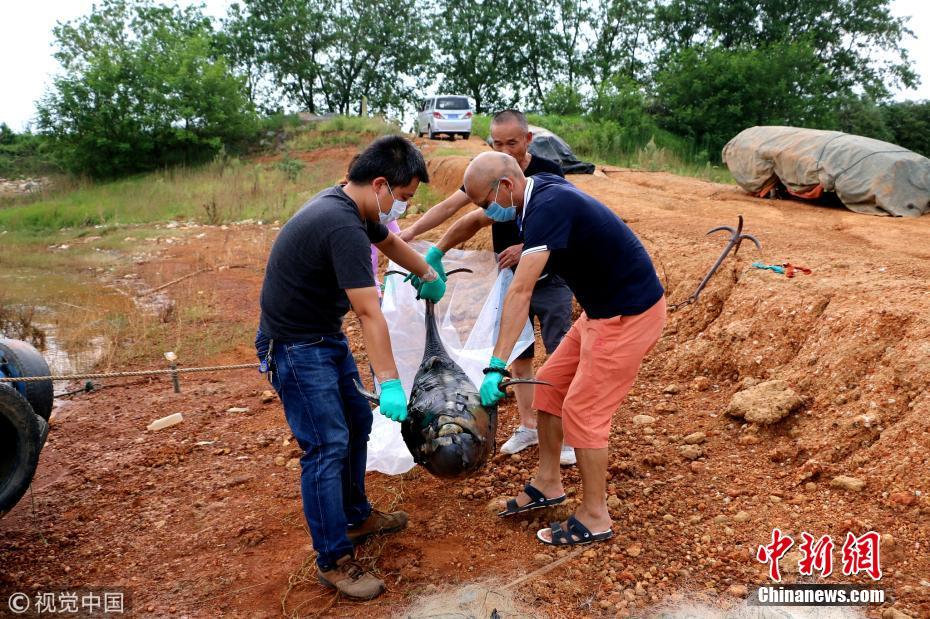 都昌護豚隊志愿者于當(dāng)日7時許將情況舉報到永修縣漁政局。11時50分左右,永修縣漁政局執(zhí)法人員到達現(xiàn)場,在查看了現(xiàn)場情況后,將死豚帶回進行了掩埋處理。洪永林 攝 圖片來源:視覺中國 文字來源:九江新聞網(wǎng)