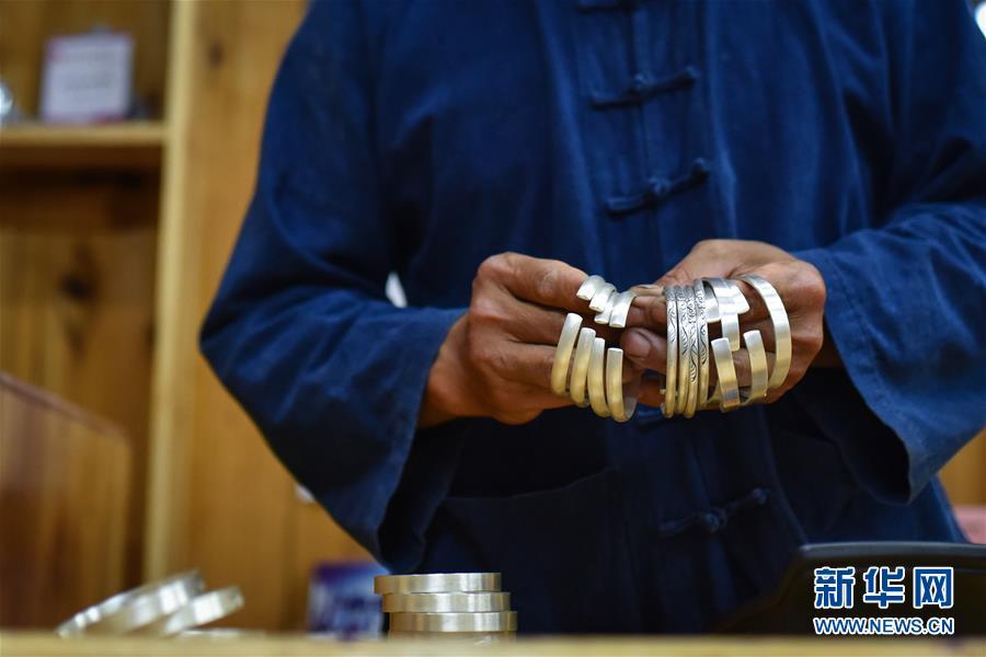8月3日,銀匠龍懂陽在銀飾店內(nèi)清點制作完成的銀質(zhì)手鐲。
