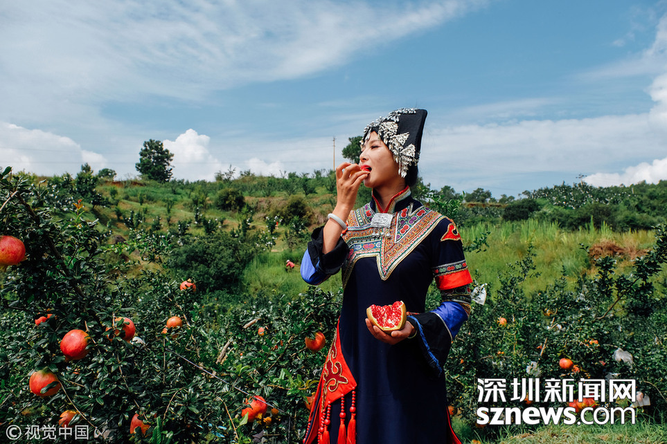 會理如今大面積種植來自北非突尼斯的軟籽石榴,籽粒柔軟,可以直接食用無需吐籽,果味兒濃甜似蜂蜜,可食部位達55.7%,自然儲藏可達3個月,冷庫儲藏可達5個月,是目前世界上籽粒最軟的石榴品種,也是中國石榴最優(yōu)秀的品種。拍攝當(dāng)天氣溫有些高,鄧通敏穿著比較厚的彝族服裝。完成拍攝后,她迫不及待想嘗嘗這剛從樹上摘下來的果子?!疤瓦m了!”鄧通敏說。