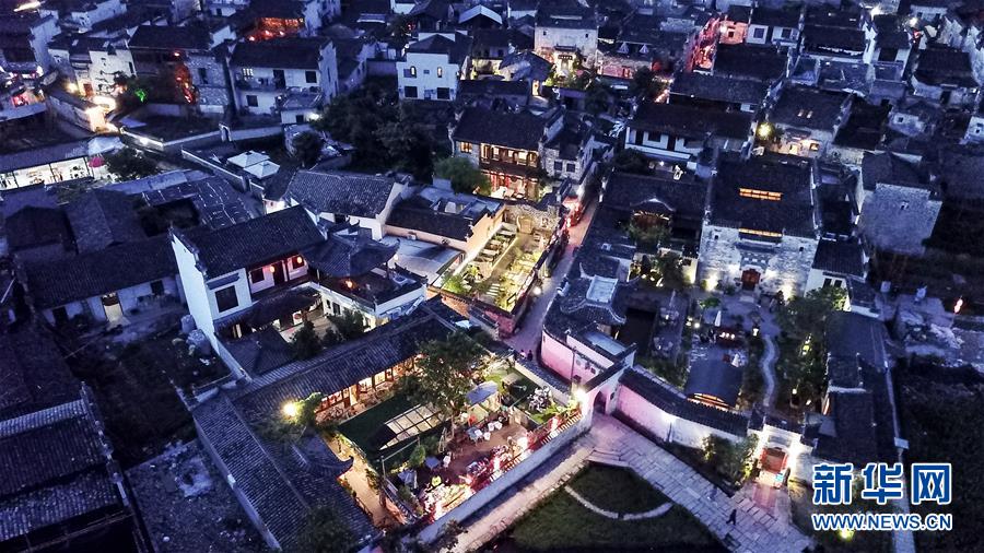 這是5月8日無人機(jī)拍攝的安徽黟縣宏村古民居夜景。