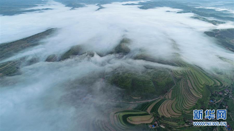 云霧繚繞的寧夏彭陽(yáng)縣金雞坪梯田公園(7月17日攝)。新華社記者 王鵬 攝