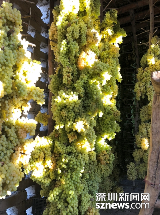 鏤空的土磚房具有良好的通透性,把葡萄搭在干樹枝上一層層碼起來高達屋頂,慢慢就會失去水分自然晾成葡萄干了。趙春麗攝
