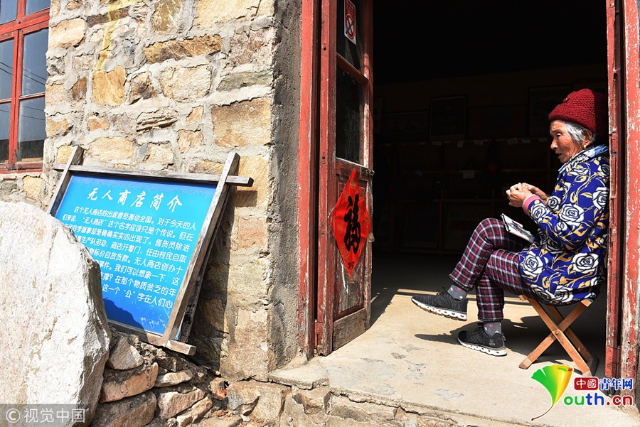 2018年3月11日,在山東省日照市五蓮縣街頭鎮(zhèn)大山深處的李崮寨村,負(fù)責(zé)管理“無人商店”的老人惠玉秀坐在商店門口納鞋墊。