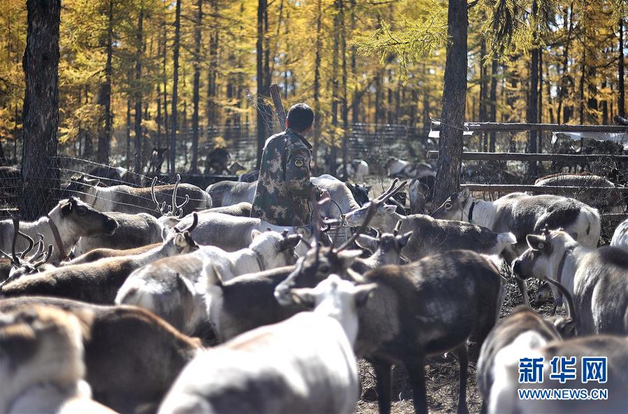 9月18日,在內(nèi)蒙古大興安嶺根河林業(yè)局約安里林場(chǎng),林場(chǎng)職工廉立臣在鹿圈補(bǔ)充飼料。新華社記者于洋攝