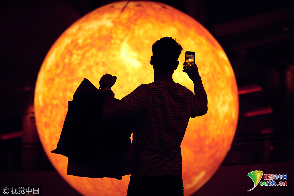 當(dāng)?shù)貢r(shí)間2018年9月18日,英國(guó)曼切斯特,顧客們?cè)谔乩5沦?gòu)物中心的一個(gè)巨型的“太陽(yáng)”下享受室內(nèi)日光浴,感受英國(guó)未完的史上最熱夏天。這個(gè)人造“太陽(yáng)”的亮度相當(dāng)于1.2萬(wàn)個(gè)燈泡。圖片來源:視覺中國(guó)