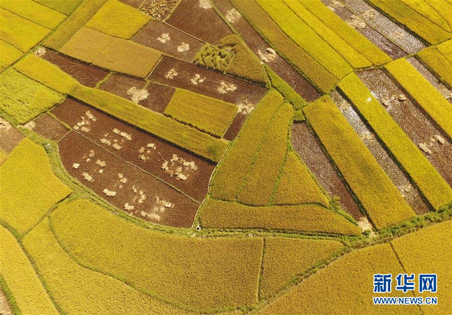 這是廣南縣八寶鎮(zhèn)壩龍村的稻田景色(9月20日無人機拍攝)。 云南省文山壯族苗族自治州廣南縣八寶鎮(zhèn)今年種植優(yōu)質(zhì)水稻22000余畝,秋收季節(jié),田野里一片金黃,景色如畫。 新華社記者楊宗友攝