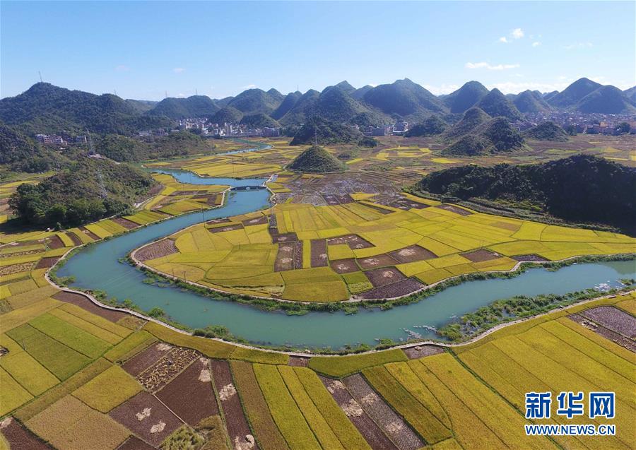 這是廣南縣八寶鎮(zhèn)壩龍村的田園景色(9月20日無人機(jī)拍攝)。 云南省文山壯族苗族自治州廣南縣八寶鎮(zhèn)今年種植優(yōu)質(zhì)水稻22000余畝,秋收季節(jié),田野里一片金黃,景色如畫。 新華社記者楊宗友攝