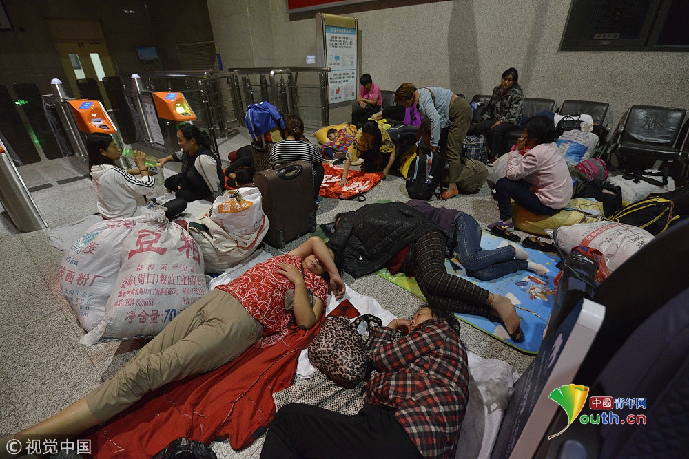 2018年9月15日,在鄭州火車站候車大廳,來自周口西華縣農(nóng)村的數(shù)百名采棉工,為趕早上4點(diǎn)50分的火車,在火車室打地鋪休息。