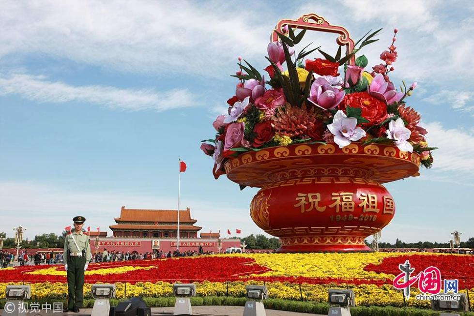 2016年天安門廣場大花籃籃體設(shè)計(jì)參考了清代畫家丁亮光“四季花籃”的畫作,花壇高17米,籃體高15.3米,直徑50米?;@中花材以牡丹、玉蘭、荷花、月季為主,配以“梅、蘭、竹、菊”等,籃體鑲嵌“祝福祖國”及“歡度國慶”文字以及1949-2016年號(hào),表達(dá)對(duì)祖國繁榮富強(qiáng)、欣欣向榮的美好祝福。