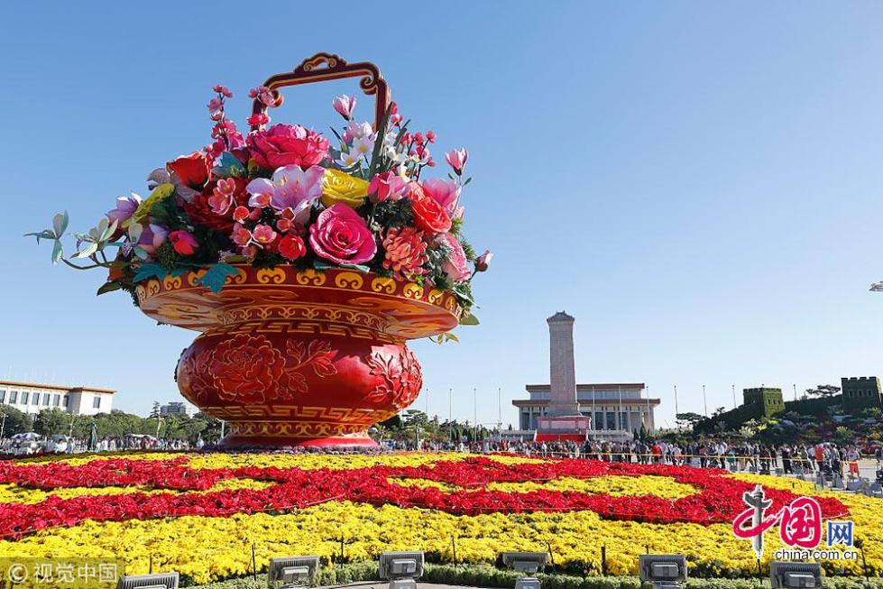 2015年的大花籃規(guī)格與往年相似,花籃依然采用正紅色,同時用金色祥云描邊,提梁為紅色鑲嵌金邊的長方形,頂端再裝飾一朵凸起的祥云?;ɑ@里已經(jīng)有20支左右的花朵,有大紅色的牡丹、玫紅色的月季,再調(diào)和以亮黃色的向日葵,粉色的玉蘭從花籃東側(cè)旁逸斜出,兩束紅梅分別繞著花籃的一側(cè)提梁向上伸展,中間點綴著些粉色桃花?;ɑ@下方放著白花黃蕊的水仙和一些綠色植物,整體配色典雅大氣,富有節(jié)日氣氛。