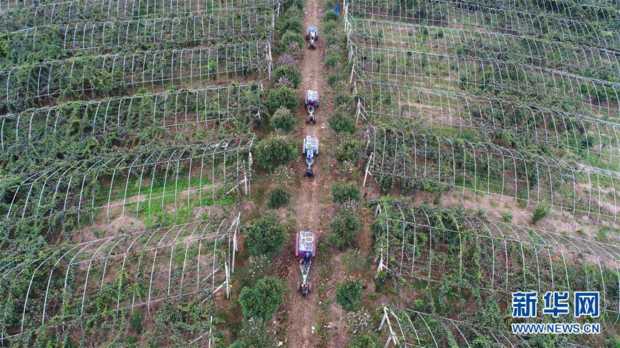 9月25日,在肥西縣銘傳鄉(xiāng)劉老圩獼猴桃種植基地,農(nóng)民運(yùn)送剛采摘的獼猴桃(無人機(jī)拍攝)。