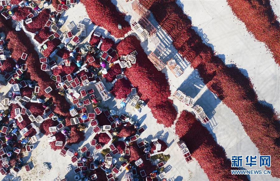 9月16日,阜城縣王集鄉(xiāng)南張莊村農(nóng)民在采摘辣椒(無(wú)人機(jī)拍攝)。近年來(lái),河北省阜城縣王集鄉(xiāng)在推進(jìn)產(chǎn)業(yè)富民過(guò)程中,積極引導(dǎo)農(nóng)民調(diào)整農(nóng)業(yè)產(chǎn)業(yè)結(jié)構(gòu),按照品種特色化、種植規(guī)?;?、產(chǎn)銷(xiāo)一體化的“公司+基地+農(nóng)戶(hù)”的經(jīng)營(yíng)模式,鼓勵(lì)農(nóng)民發(fā)展特色辣椒種植,推行“訂單種植”模式,開(kāi)辟出了一條農(nóng)民創(chuàng)收新路徑。目前,阜城縣王集鄉(xiāng)辣椒種植面積3100余畝,每畝年收益2500元以上,帶動(dòng)當(dāng)?shù)剞r(nóng)民實(shí)現(xiàn)增收。新華社記者朱旭東攝