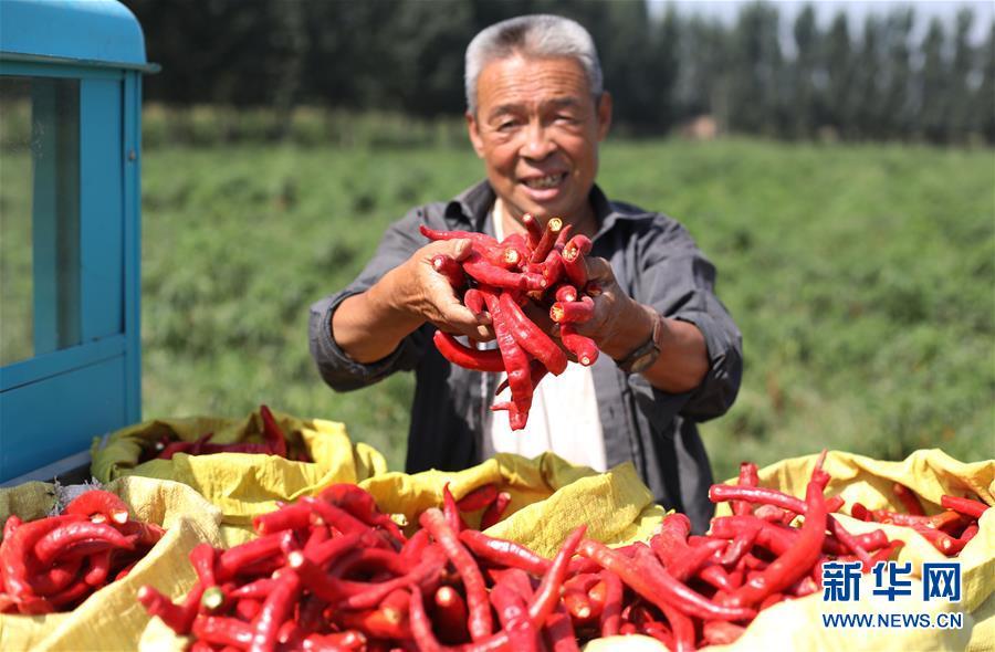 9月16日,阜城縣王集鄉(xiāng)南張莊村農(nóng)民在展示采摘的辣椒。近年來,河北省阜城縣王集鄉(xiāng)在推進產(chǎn)業(yè)富民過程中,積極引導農(nóng)民調(diào)整農(nóng)業(yè)產(chǎn)業(yè)結(jié)構(gòu),按照品種特色化、種植規(guī)?;?、產(chǎn)銷一體化的“公司+基地+農(nóng)戶”的經(jīng)營模式,鼓勵農(nóng)民發(fā)展特色辣椒種植,推行“訂單種植”模式,開辟出了一條農(nóng)民創(chuàng)收新路徑。目前,阜城縣王集鄉(xiāng)辣椒種植面積3100余畝,每畝年收益2500元以上,帶動當?shù)剞r(nóng)民實現(xiàn)增收。新華社記者朱旭東攝